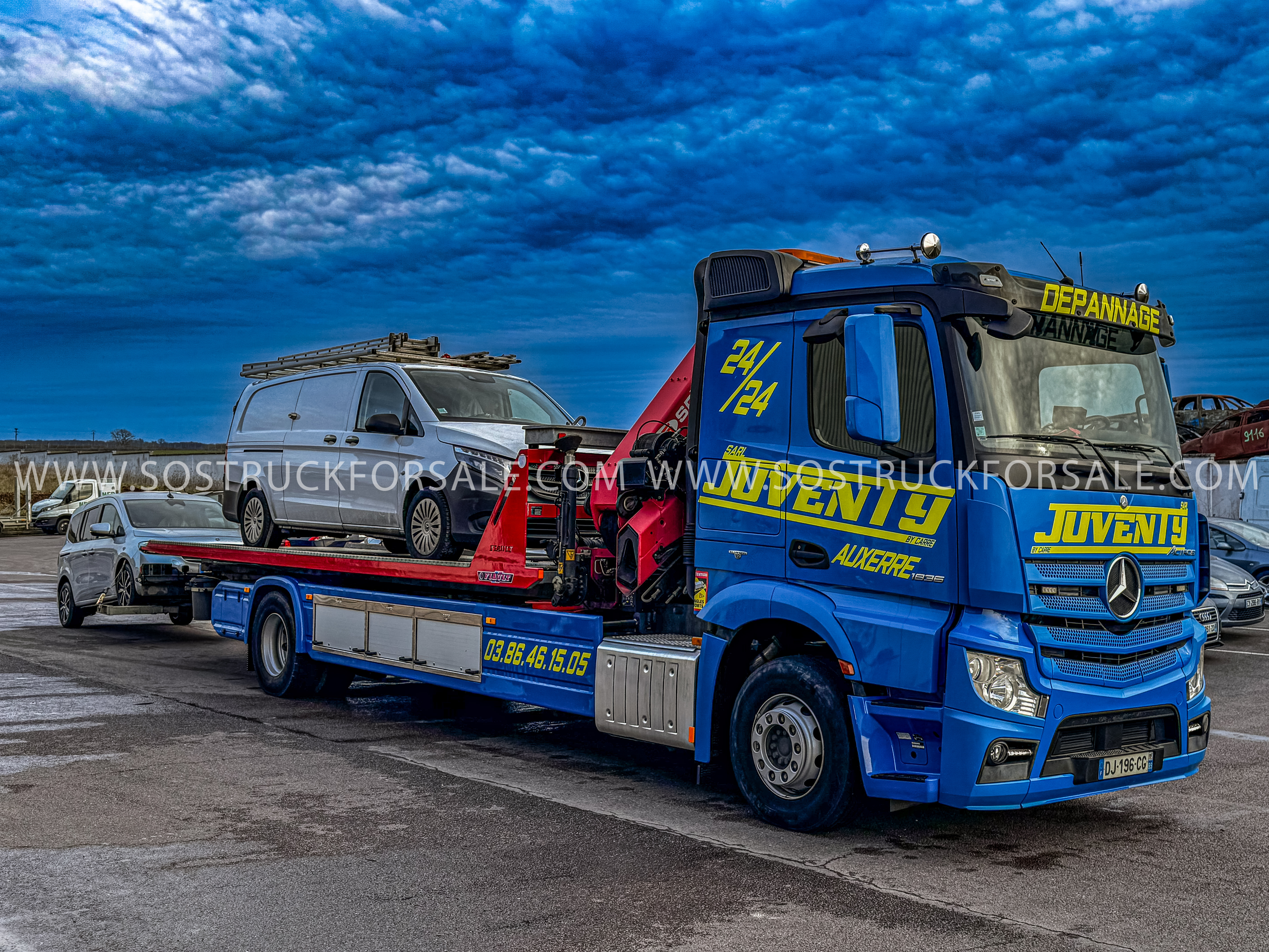 Dépanneuse Plateau grue à vendre Mercedes Actros 1836 - Fiault Cabine 6 places Boite de vitesse automatique Année : 07/2014 - 35.000 km Prix : 220.000 € HT Équipement de Dépannage FIAULT Plateau coulissant basculant Plat'Sol Longueur : 7,50 m 4 Coffres de rangement d'outillage Treuil sur le Panier de remorquage Grue auxiliaire PM 23.5 + Treuil Capacité : 1020 kg à 14,50 m Palonnier sur plateau Très bon état
