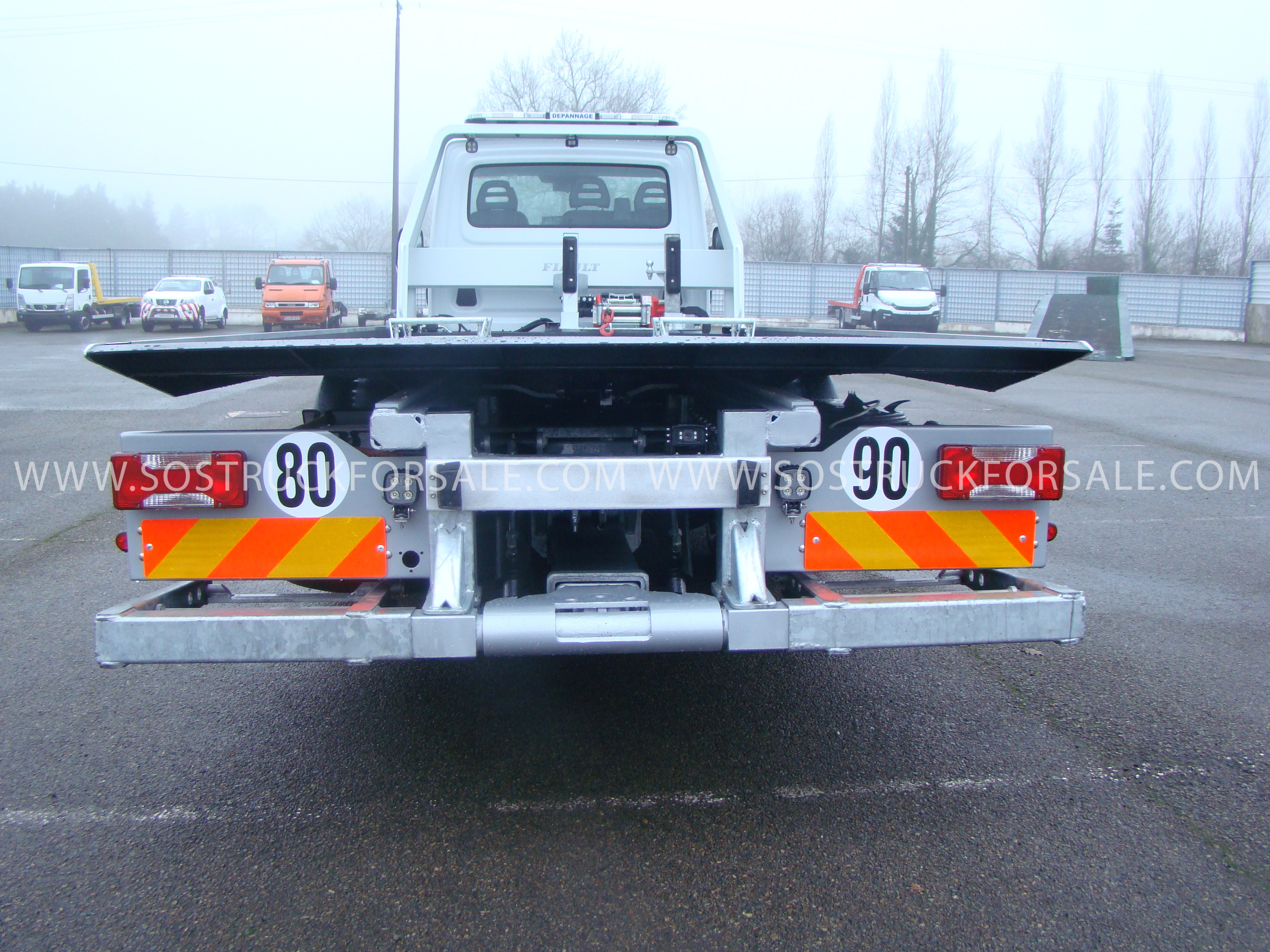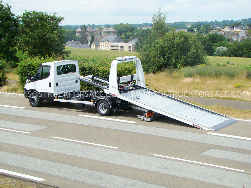 PLAT'TRANS PF30 en acier sur Iveco Daily 7T, cabine double. Porte-voiture basculant et coulissant avec plateforme renforcée anti-dérapante. Glissières en acier galvanisé, hydraulique avec pompe grand débit, vérins à double effet avec clapets de sécurité. Treuil hydraulique fixe de 3,6T. Véhicule NEUF conforme au Code de la Route. Contactez-nous pour plus d'infos.