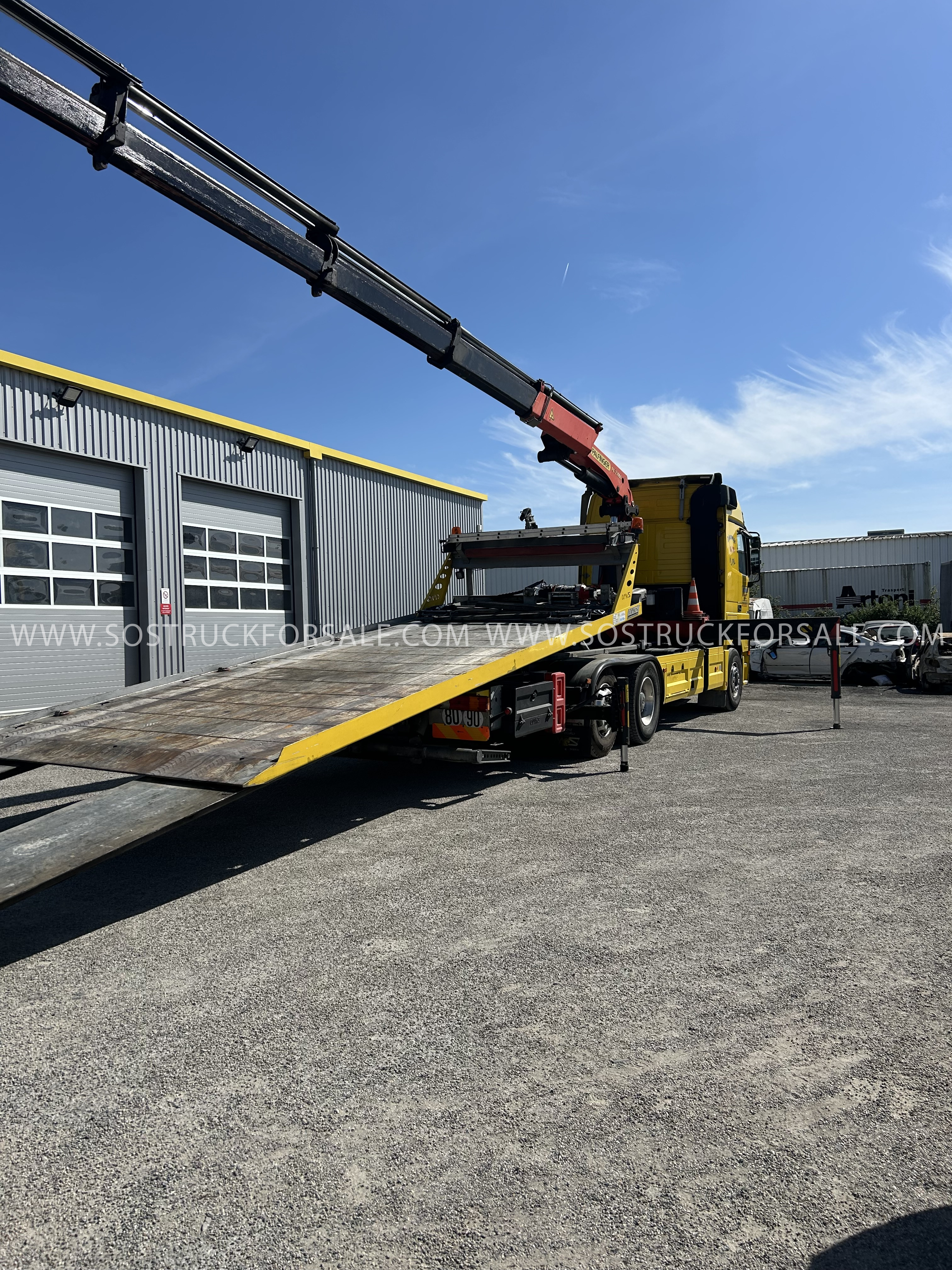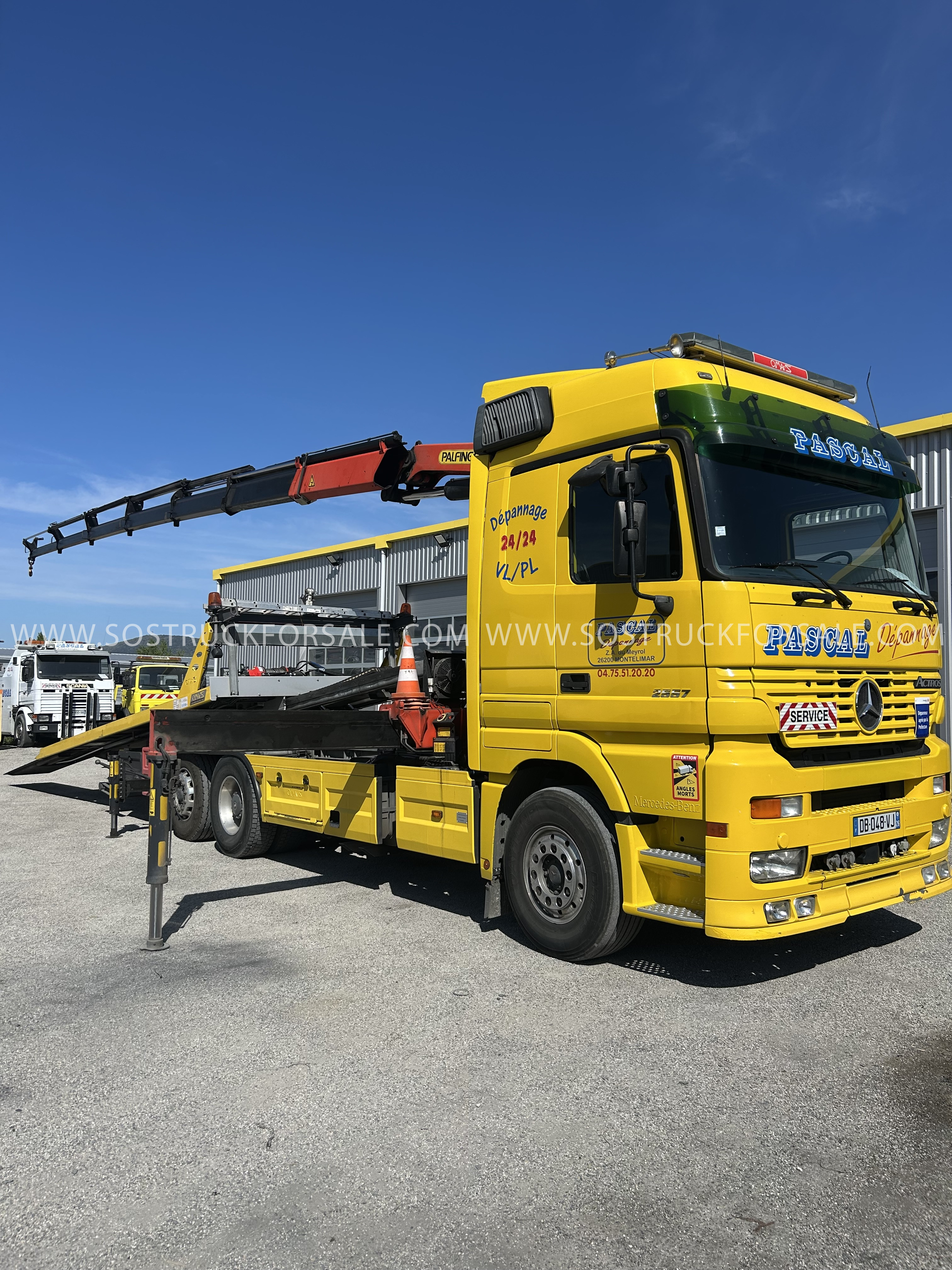 Dépanneuse Plateau Grue à vendre Mercedes Actros 2557 - OMARS Boite de vitesse automatique Année 2002 - 430.000 km Prix : 85.000 € HT Grue plafinger 27 t/m Equipement Dépanneuse Omars Plateau Coulissant Basculant Panier de remorquage capacité 5 t Rampes hydraulique extensibles