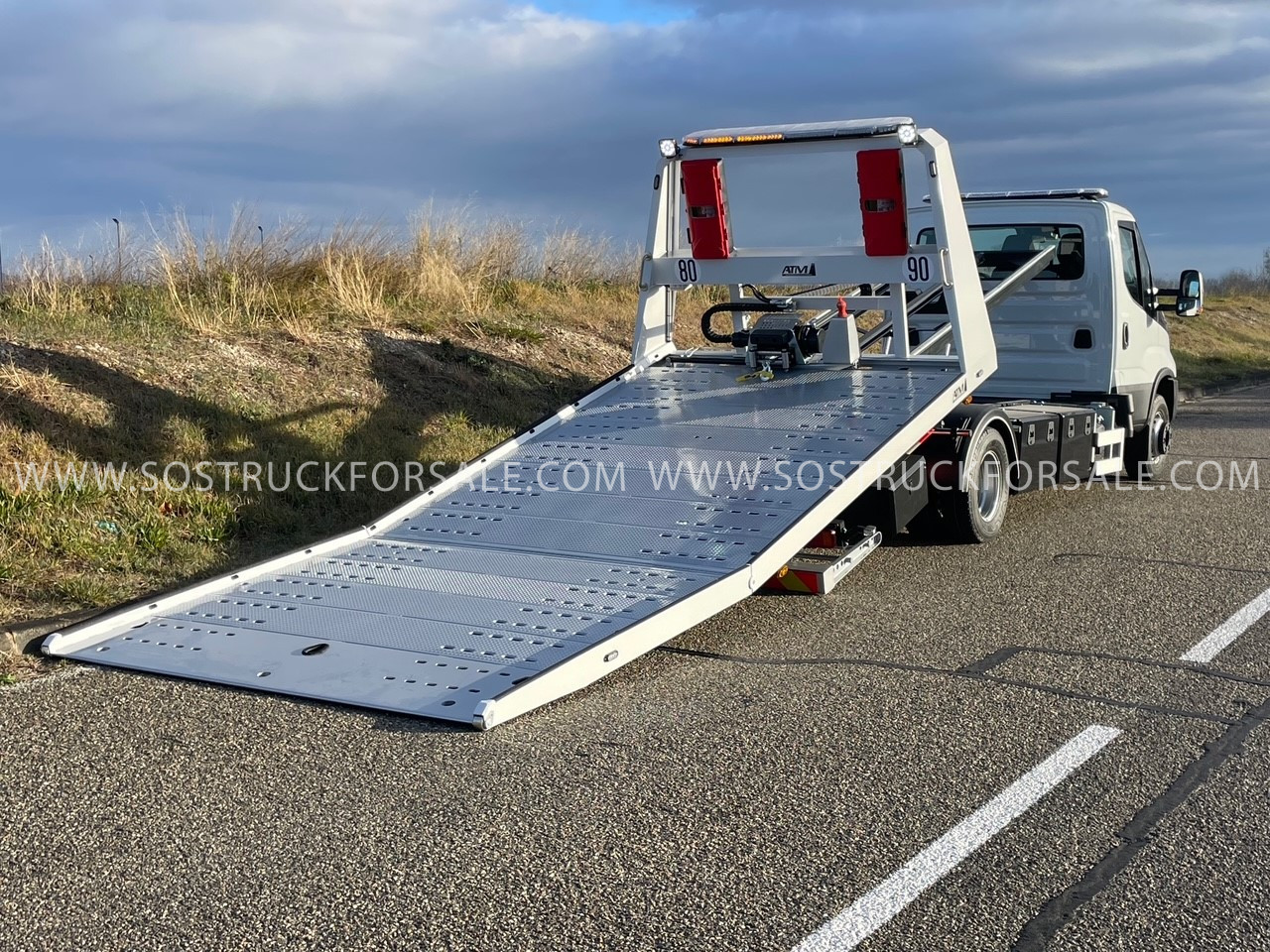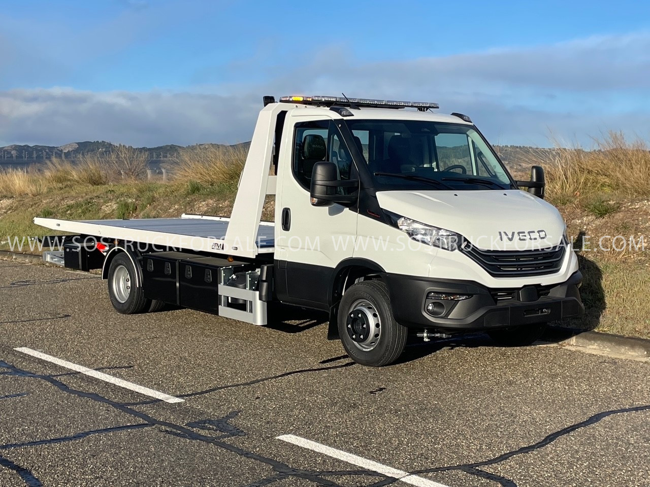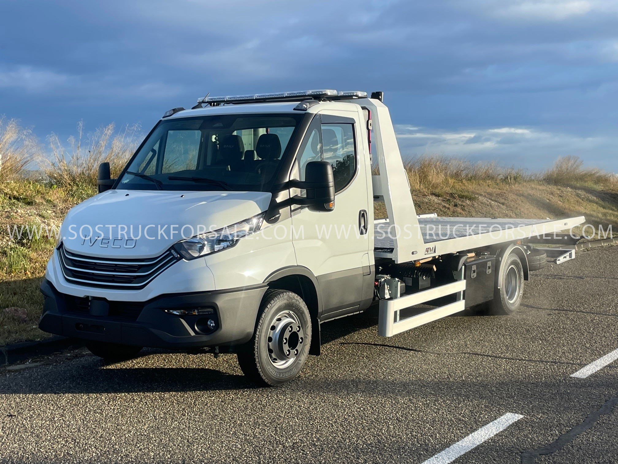 Dépanneuse Neuve à vendre Iveco Daily 72C18 Année 2026 Prix : 104.000 € HT Simple Cabine 3 places Empattement 4350mm Pack Confort Plus : Suspension Pneumatique Blocage De Differenciel Climatisation Automatique Anti-Franchissement De Ligne Hi-Connect+Gps+Camera De Recul. Dimension plateau 5,30 m x 2.30m. Plateau porte-voiture coulissant basculant hydraulique avec articulation arrière (diminution angle de chargement), en acier électrozingué et peinture gris métal, tôle larmée en pointe de diamant. Panier de remorquage avec fourches réglables latéralement avec phares de travail LED Treuil hydraulique 3629 kg à déplacement latéral 1 Rampe lumineuse LED installée sur cabine + 1 Rampe lumineuse LED installée sur Rollbar grand modèle , 2 phares de travail LED installés sur Roll bar. 3 coffres à outils métalliques 800 mm 3 Poulies de renvoi de câble ou poulies de mouflage électrozinguées avec logement sur 11 emplacements 8 Feux de pénétrations ou “flash” : 2 sur calandre, 2 sur Roll bar, 4 sur bords de rive plateau Commande radio 8 fonctions Prise de démarrage 12 V de chaque côté du véhicule Cale support porte moto Dépanneuse livrée avec carte grise et carte blanche blanche