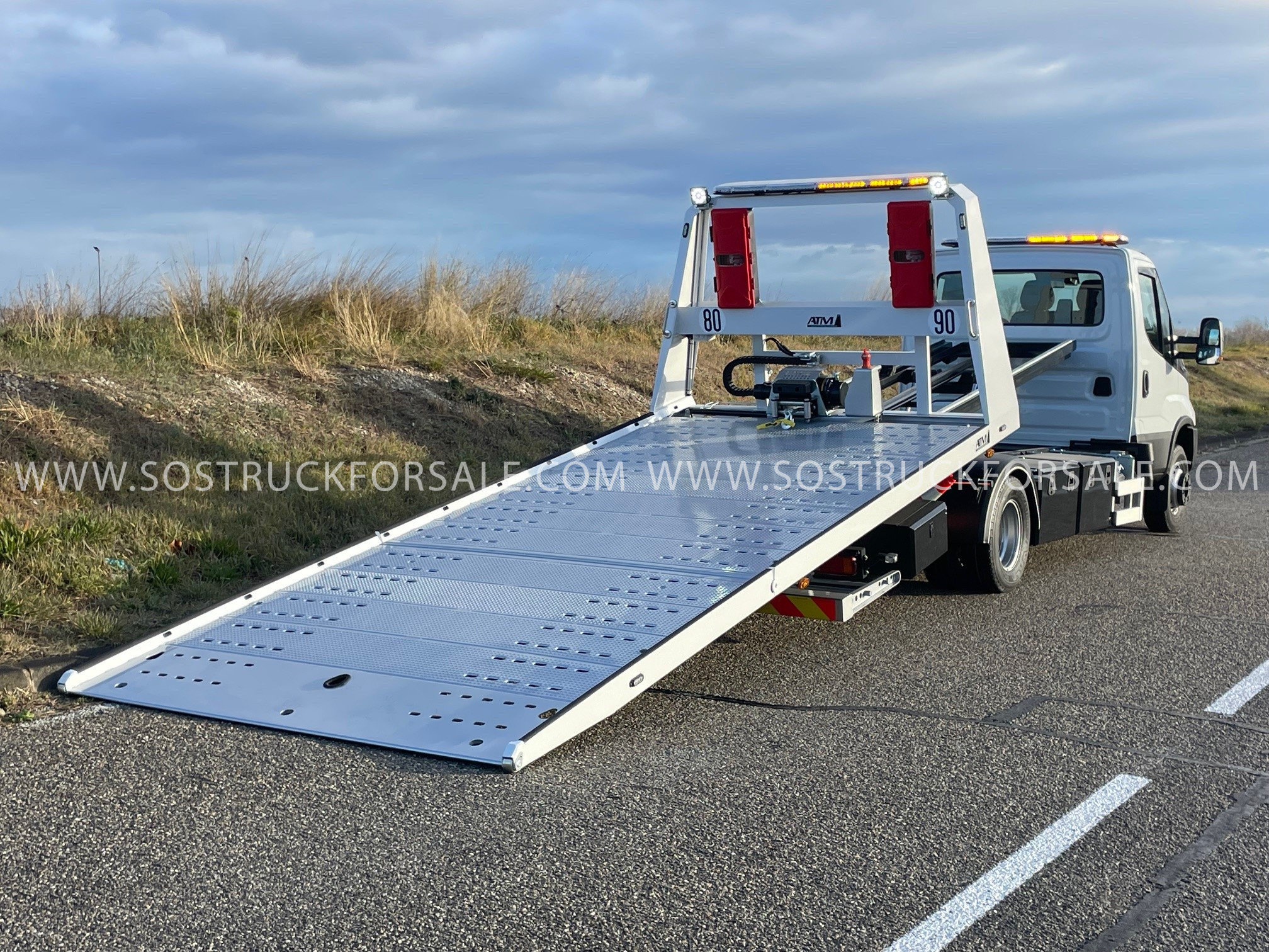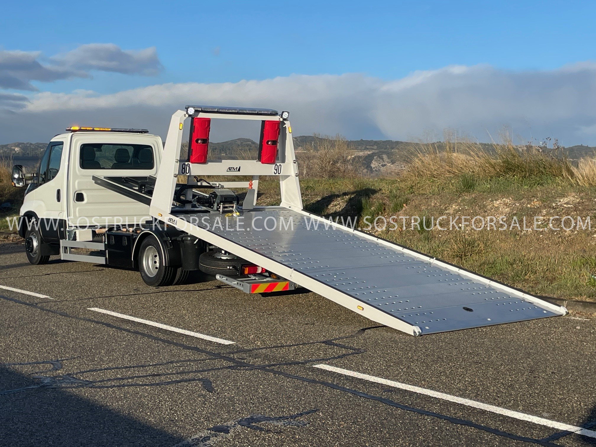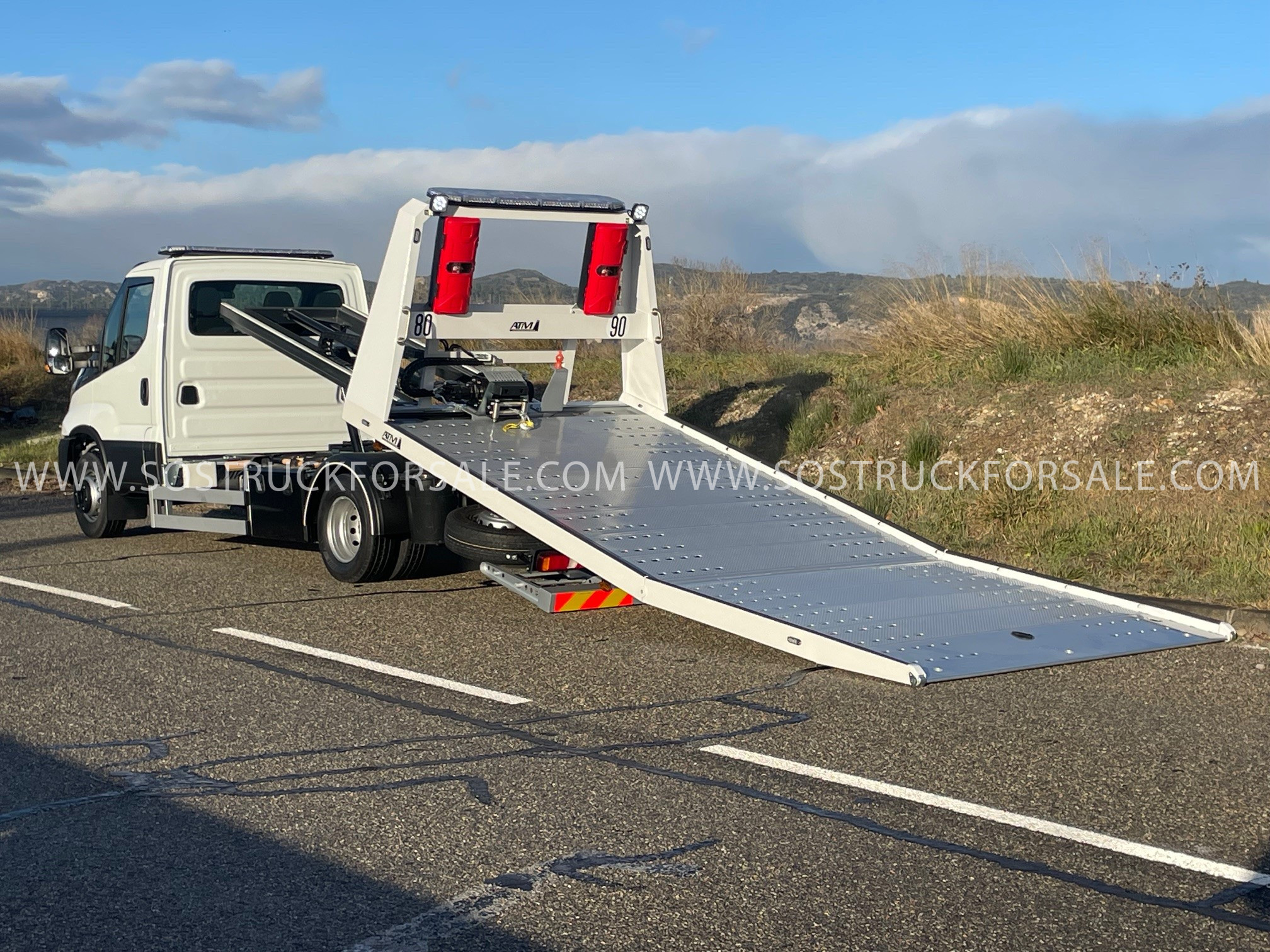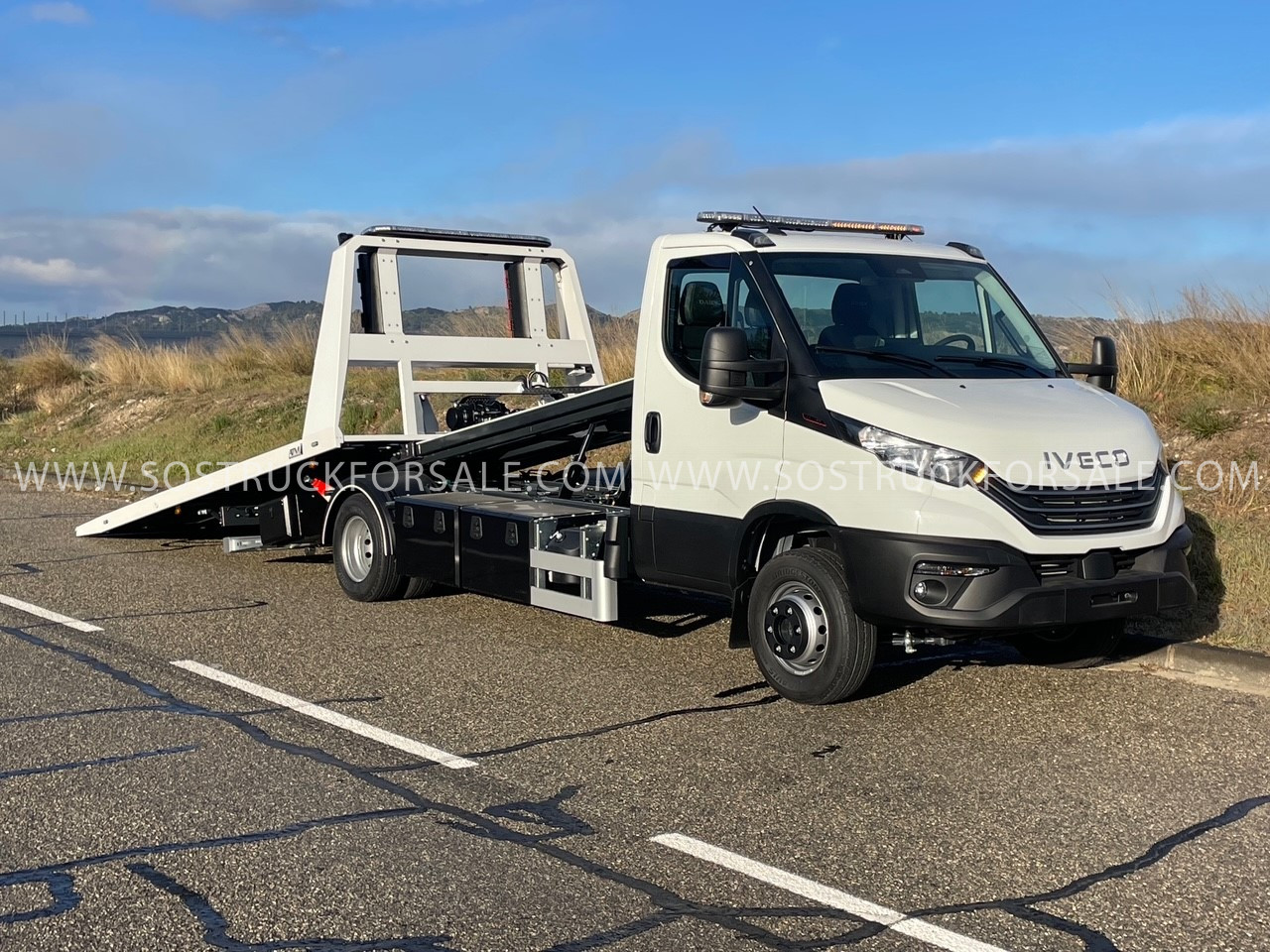 Dépanneuse Neuve à vendre Iveco Daily 72C18 Année 2026 Prix : 104.000 € HT Simple Cabine 3 places Empattement 4350mm Pack Confort Plus : Suspension Pneumatique Blocage De Differenciel Climatisation Automatique Anti-Franchissement De Ligne Hi-Connect+Gps+Camera De Recul. Dimension plateau 5,30 m x 2.30m. Plateau porte-voiture coulissant basculant hydraulique avec articulation arrière (diminution angle de chargement), en acier électrozingué et peinture gris métal, tôle larmée en pointe de diamant. Panier de remorquage avec fourches réglables latéralement avec phares de travail LED Treuil hydraulique 3629 kg à déplacement latéral 1 Rampe lumineuse LED installée sur cabine + 1 Rampe lumineuse LED installée sur Rollbar grand modèle , 2 phares de travail LED installés sur Roll bar. 3 coffres à outils métalliques 800 mm 3 Poulies de renvoi de câble ou poulies de mouflage électrozinguées avec logement sur 11 emplacements 8 Feux de pénétrations ou “flash” : 2 sur calandre, 2 sur Roll bar, 4 sur bords de rive plateau Commande radio 8 fonctions Prise de démarrage 12 V de chaque côté du véhicule Cale support porte moto Dépanneuse livrée avec carte grise et carte blanche blanche