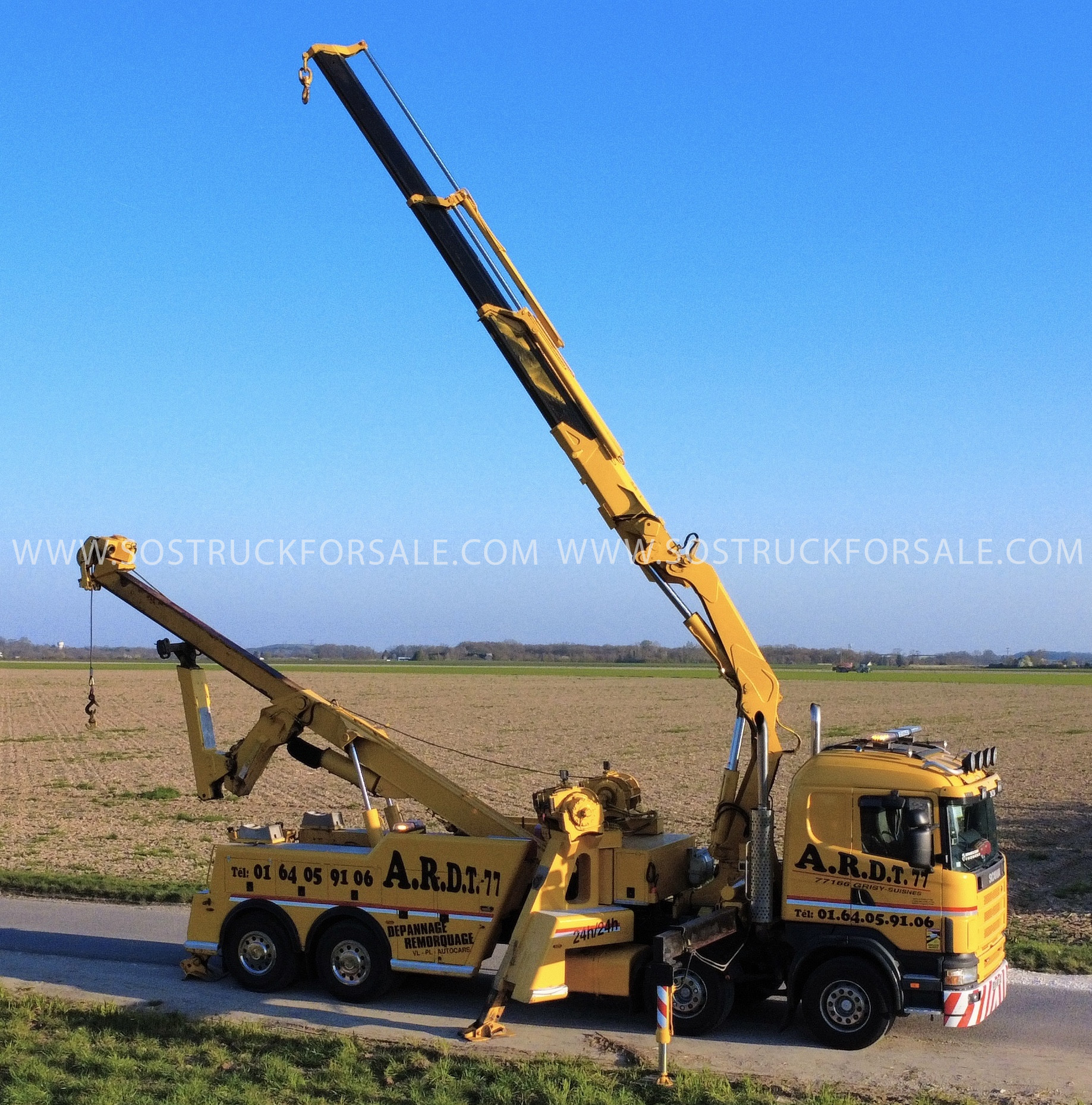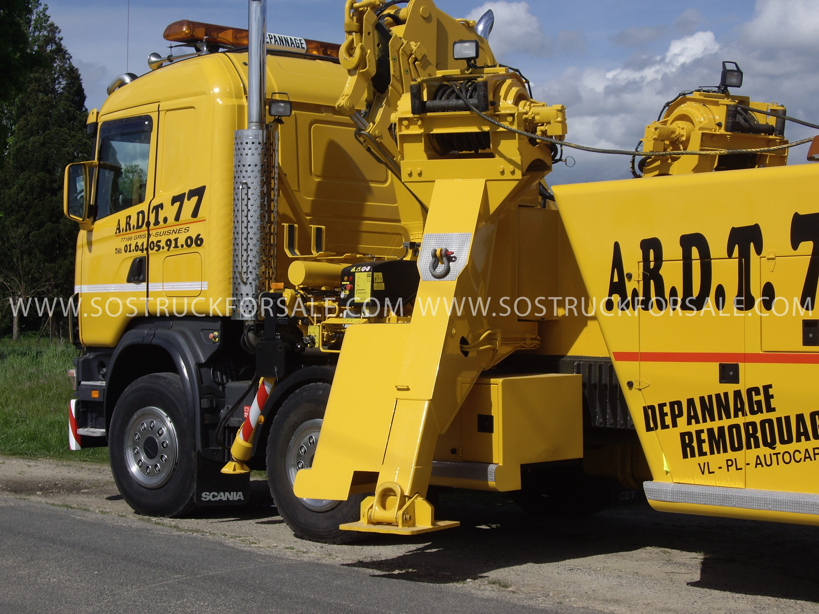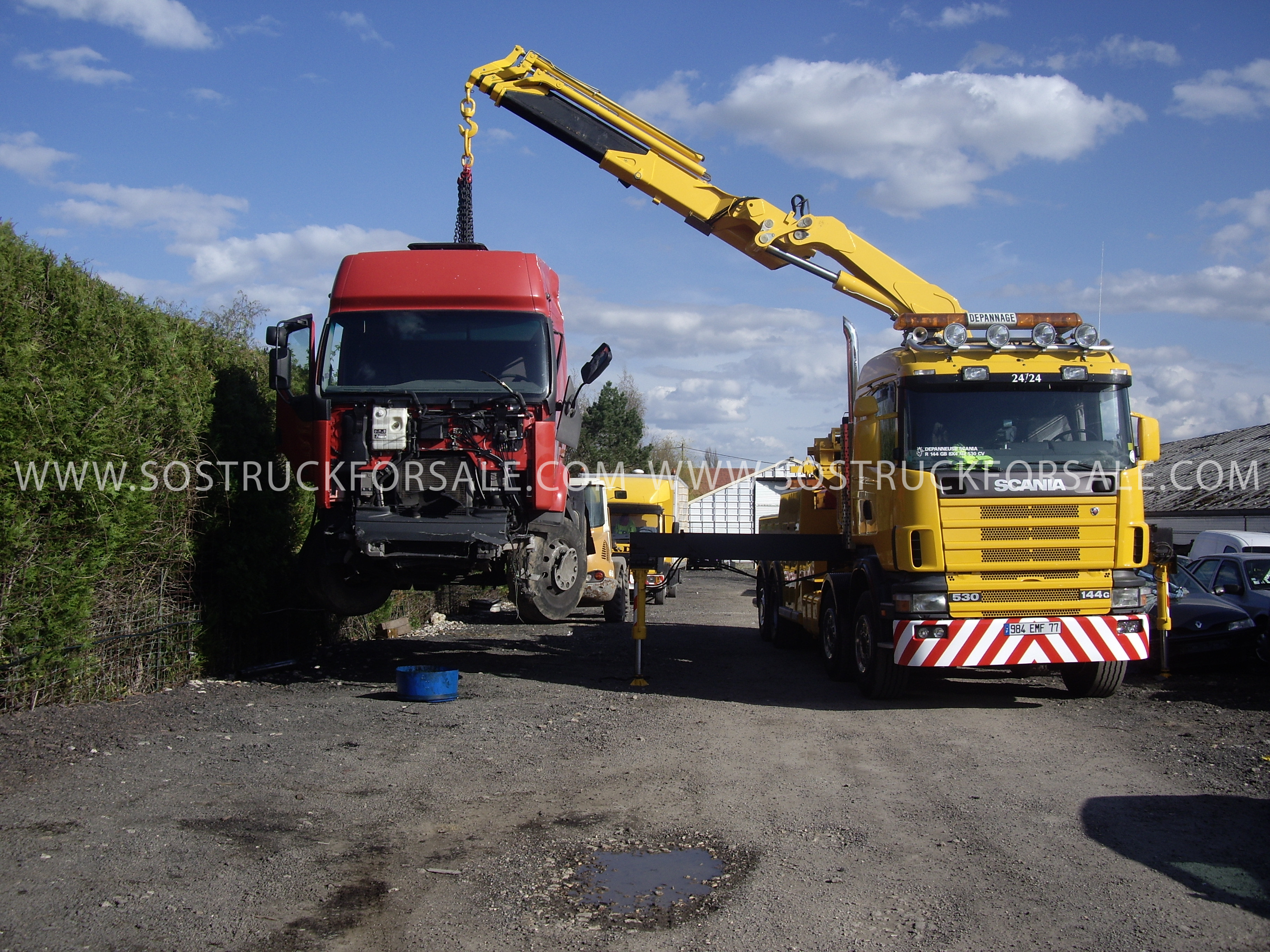 Vends Scania 144 8X4 530cv-Année 07/2000-446 780 Kms-Equipement CEV, 2 Treuils 20 T + Sinde Winder + Bras de remorquage. Grue FASSI 36T/M. Prix : 210 000 € HT