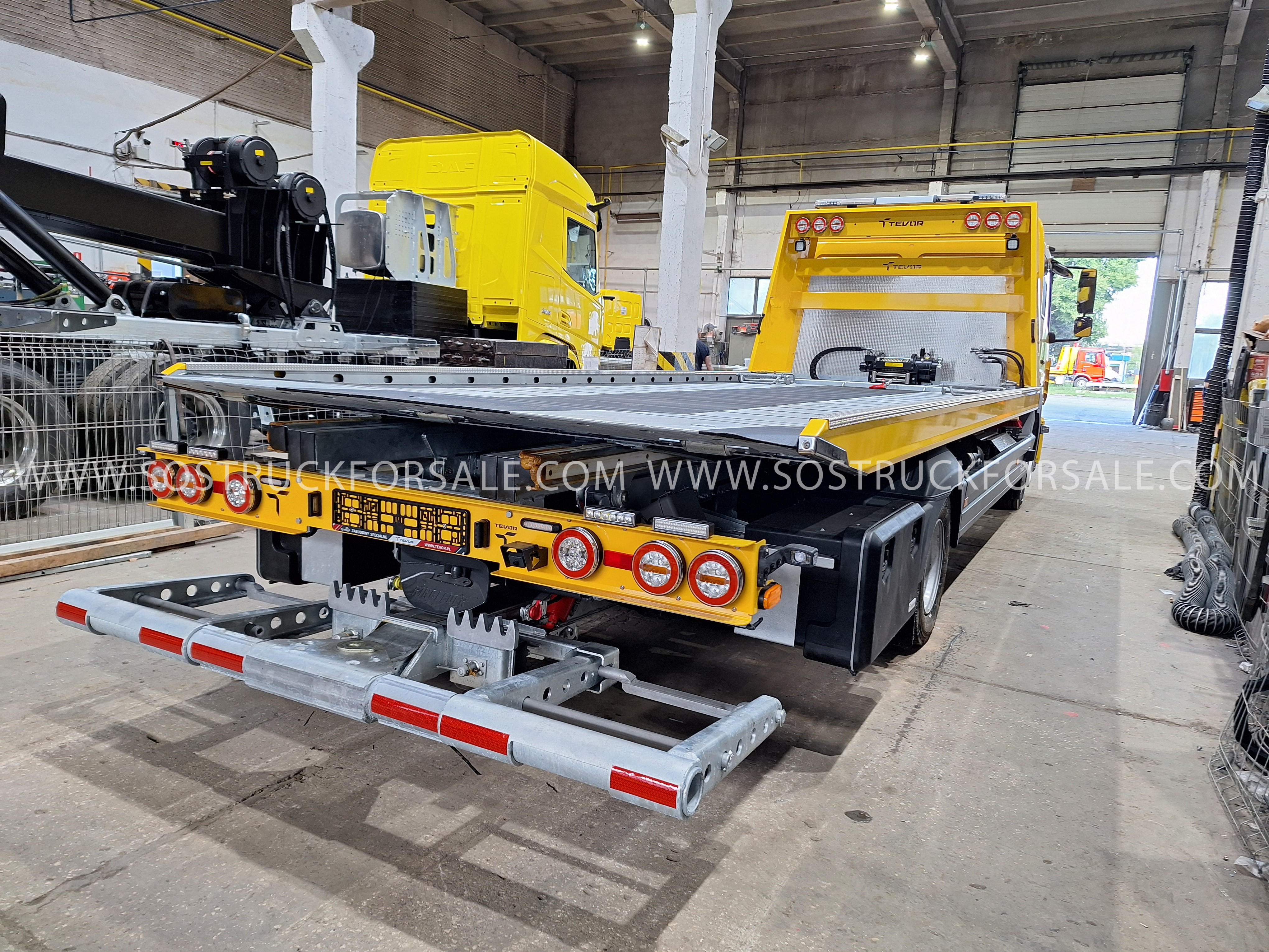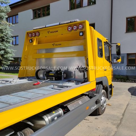 Dépanneuse avec plateforme hydraulique type TEVOR ZP50C1 sur châssis Mercedes-Benz ATEGO 1224 LnR - automattique Longueur : 6400 mm. Largeur : 2450 mm. Charge utile : 5000 kg. Poids total autorisé en charge : 11 990 kg. Options : Treuil électrique de capacité de traction 5100 kg au maximum, Déplacement transversal du treuil à commande hydraulique, Nombreux éclairage, Panier de remorquage, Coffres à outils, Attelage ROCKINGER...