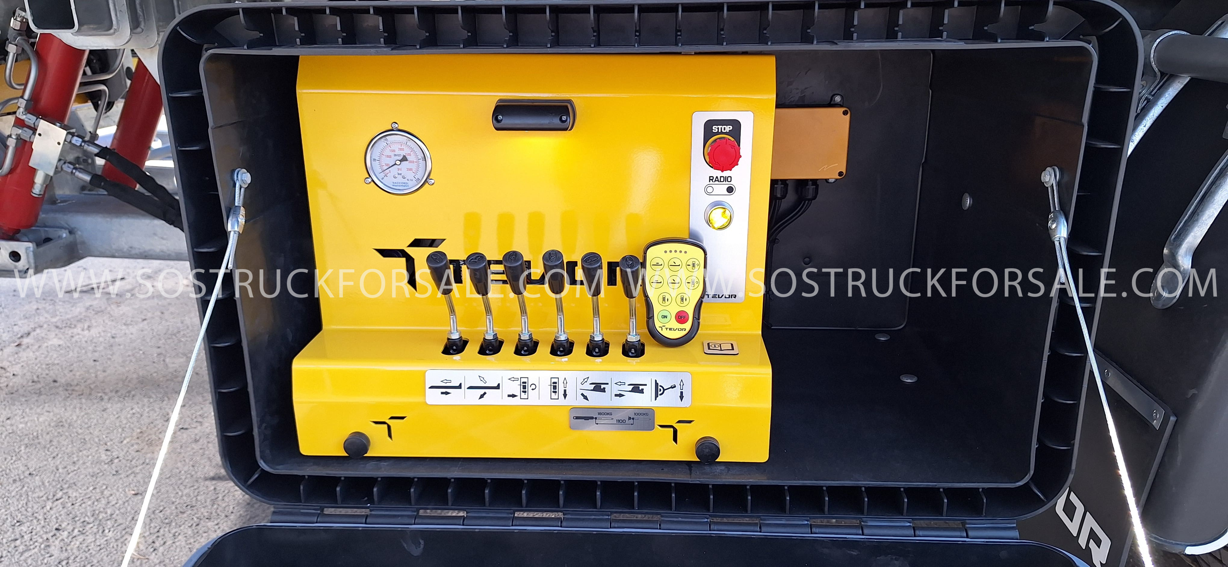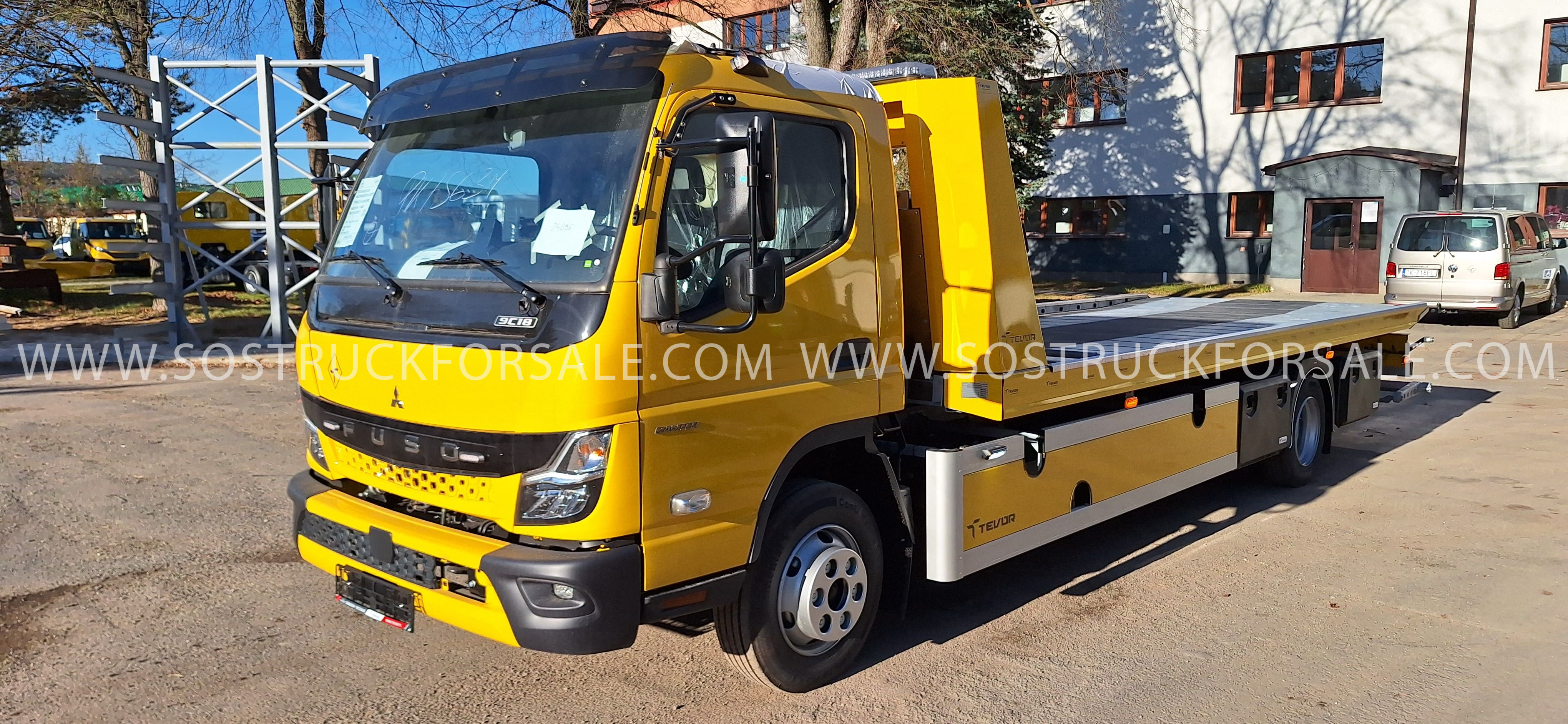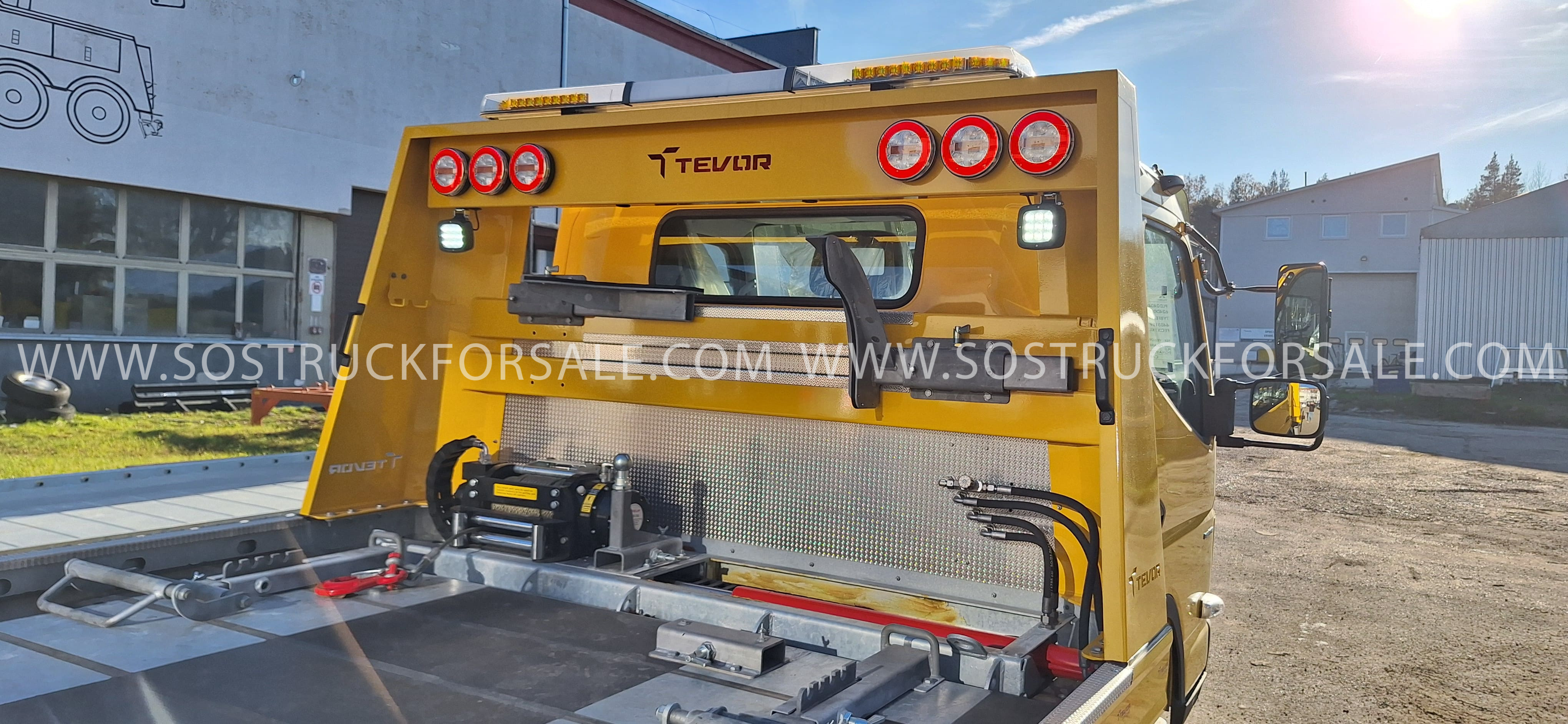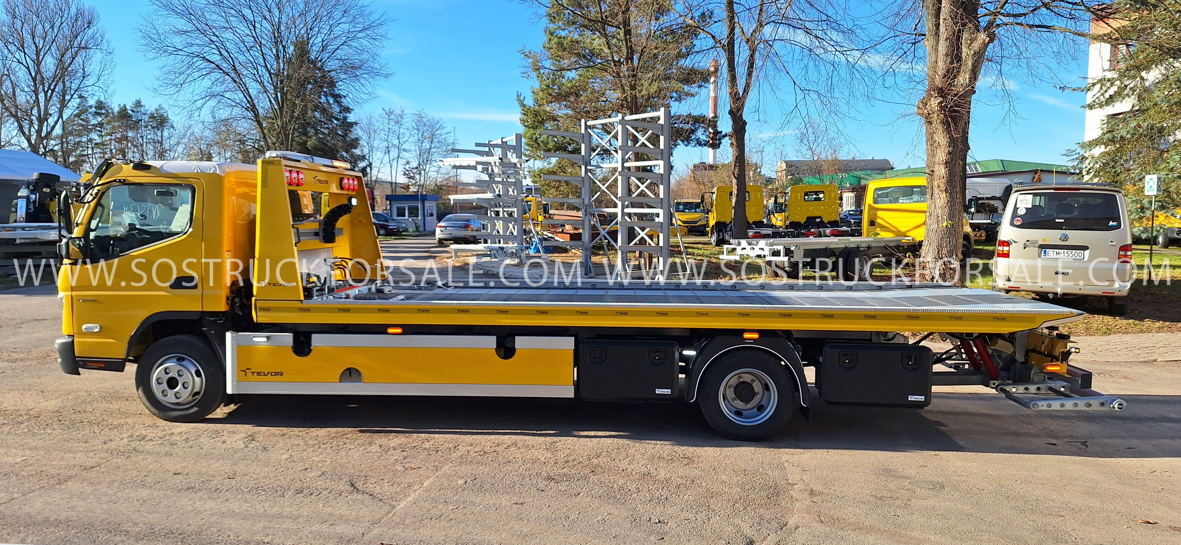 Dépanneuse avec plateforme hydraulique type TEVOR ZP30-C1 sur châssis FUSO CANTER 9C18 AMT 4X2 Longueur : 6700 mm, Largeur : 2350 mm, Capacité de charge technique : 3000 kg, PTAC : 8,55 t, Cet équipement comprend : flèche de remorquage, Treuil hydraulique avec une capacité de traction maximale de 3500 kg, Réglage transversal hydraulique du treuil, Nombreux éclairages,, Barre de remorquage de 3,5 t, connecteur électrique, panier coulissant...