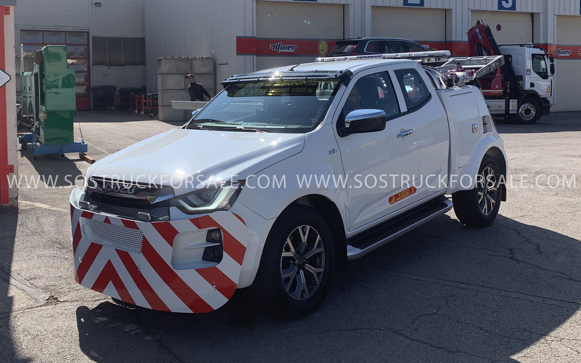 DEPANNEUSE NEUVE REF 14451 - PRIX SUR DEMANDE • Bras de remorquage capacité 1.7t • Faux châssis renforcé, galvanisé à chaud pour une protection anti-corrosion optimum et posé avec mise à dimensions optimisée du porte-à-faux. • Corps de flèche et télescope hydrauliques avec correction d'assiette. • Intégration lest spécial sous pare choc avant. • Compresseur d'air 8 bars avec bouteille et prise d'air dans le coffre côté droit. • Suspension renforcée à lames paraboliques, amortisseurs, barre type Panhard et coussins d'air. • Groupe électro-hydraulique 12V avec réservoir incorporé et coupe circuit. • Système hydraulique haute performance, réseau de flexibles, valve équilibrage, circuit de commande de qualité. • Carrosseries polyester avec ailes arrière, peinture standard idem cabine Isuzu. • Pilotage par commande radio de toutes les fonctions du bras. • Panier réglable et ouvrant ultra léger en aluminium. • Livré avec un jeu de sangles d'arrimage panier. • Peinture de base bras standard en rouge RAL 3020. • Panier manuel